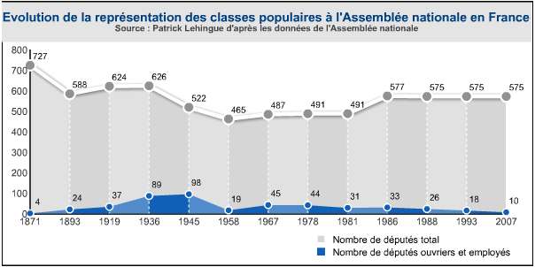 Les parlementaires (députés, sénateurs...) sont dans leur grande majorité des bourgeois ou petits-bourgeois idéologiquement acquis au capitalisme. Les professions libérales (avocats, médecins...), les cadres supérieurs, et les chefs d'entreprises y sont au contraire sur-représentés. Pour pouvoir mener une campagne, il faut du temps, des moyens, du « réseau », et le plupart du temps le soutien d'un grand parti. Les partis dominants sont généralement ceux qui ont le soutien (financier, médiatique...) de secteurs significatifs de la bourgeoisie. Par ailleurs quelle que soit leur origine sociale, les privilèges matériels octroyés aux parlementaires font qu'ils intègrent vite la classe dominante.