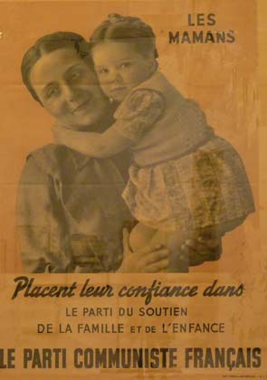L'IC fait son tournant vers la logique de Front populaire en 1934. La Section française de l'Internationale communiste (SFIC) adopte alors le "F" de PCF, et s'inscrit en défense de "la démocratie". En parallèle, le PCF vante les valeurs traditionnelles et dominantes, dont la famille traditionnelle. Par exemple dans cette affiche où Maurice Thorez et sa femme Jeannette Vermeersch prêtent leurs traits à une "famille idéale", chacun est à sa place. On retrouve "la mère" dans cette affiche de 1936 du Parti communiste espagnol.